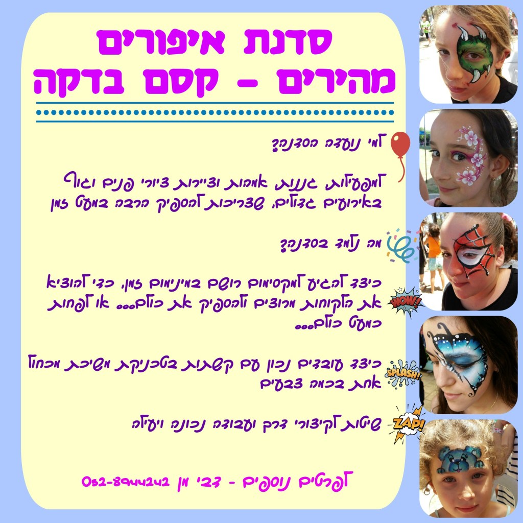 - לגילאים הצעירים יש שימוש אך ורק בצבעי איפור על בסיס מים, הנשטפים בקלות, היפו-אלרגניים ומאוד עדינים, כך שגם בעלי עור רגיש יוכלו לקחת חלק בפעילות.